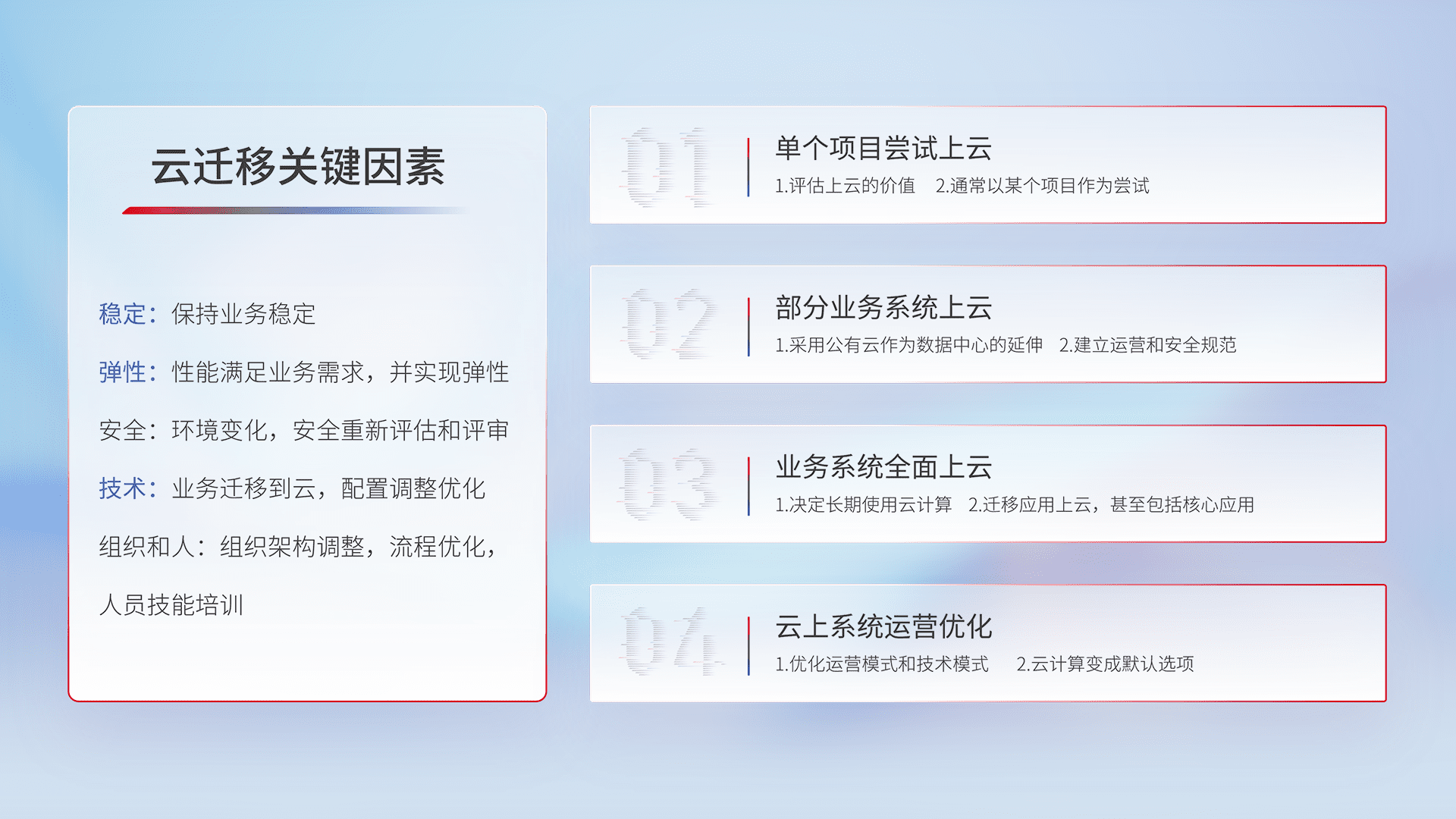 结合实际业务,,从规划设计、、云平台选型、、、云原生改造、、数据迁移、、、、集成交付,,迁移全过程为客户识别最佳上云路径,,,,做好风险识别管理,,,设计网络架构、、身份权限、、、安全审计合规、、、操作审计、、、日志审计、、、监控告警策略、、、多站点容灾设计等,,,,对云上基础设施进行整体规划,,,,提升IT治理水平,,以满足弹性、、、高可用、、、高性能的需求。。。。